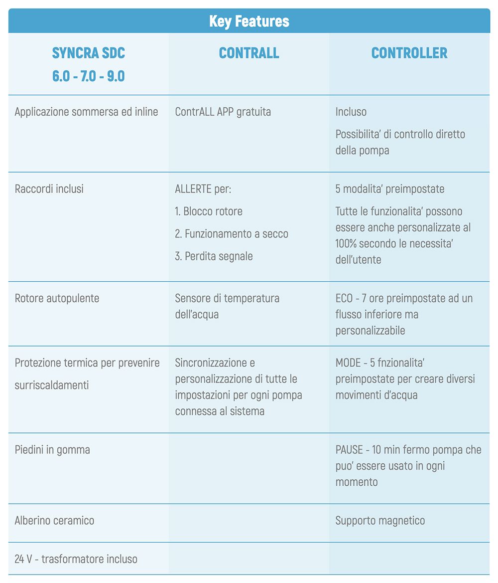 La linea SYNCRA SDC rappresenta l'ultima generazione di pompe SYNCRA ed incorpora sistemi di intelligenza integrati per applicazioni di ricircolo dell’acqua in sistemi avanzati. Libertà di programmazione, controllo, ottime prestazioni, efficienza energetica, possibilità di uso sia in linea che sommerse e bassa temperature di esercizio rendono questa nuova gamma di pompe uniche per le loro peculiarità. SYNCRA SDC sono controllabili con un controller facile da usare o con il proprio smartphone eseguendo il download gratuito della nuova APP CONTRALL che rende queste pompe programmabili e controllabili ovunque sia disponibile l'accesso a Internet. CONTRALL include un sistema di allerta che mantiene l'utente finale aggiornato in tempo reale sullo stato della pompa.